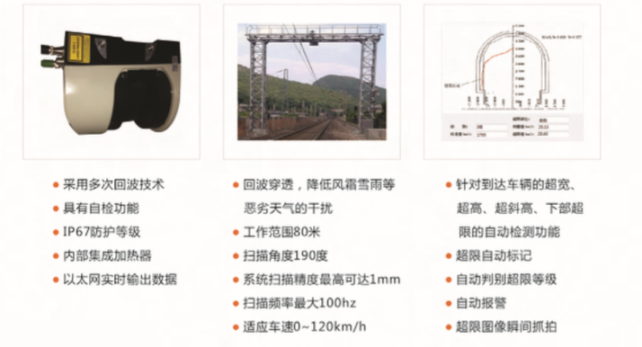 鐵路貨車超限檢測(cè)系統(tǒng)是保障鐵路貨運(yùn)運(yùn)輸安全的重要設(shè)備。系統(tǒng)通過實(shí)時(shí)檢測(cè)列車裝載狀態(tài),依 據(jù)鐵路超限超重貨物運(yùn)輸規(guī)則》自動(dòng)判斷貨物是否超限,以及超限的尺寸、超限等級(jí)、部位等。當(dāng)檢測(cè) 到超限車輛時(shí),通過報(bào)警提示用戶注意,并提供超限部位圖像信息,以便人工查驗(yàn)。