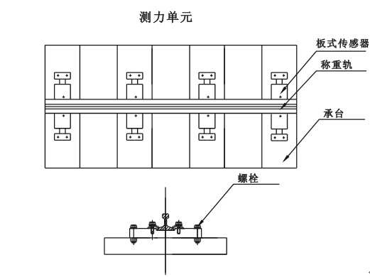 每個測力單元主要由三只板式傳感器構(gòu)成,鋼軌通過扣件固定在板式傳感器上,板式傳感器通過螺栓與預(yù)埋的結(jié)構(gòu)件相連。這種測力結(jié)構(gòu)簡捷高效,不需要秤梁,也不需要傳感器的限位及其它附屬機(jī)構(gòu),整個測力單元穩(wěn)定可靠,安裝、使用及維護(hù)十分方便。由于傳力直接,可實現(xiàn)準(zhǔn)確稱量。具體方案如下圖: